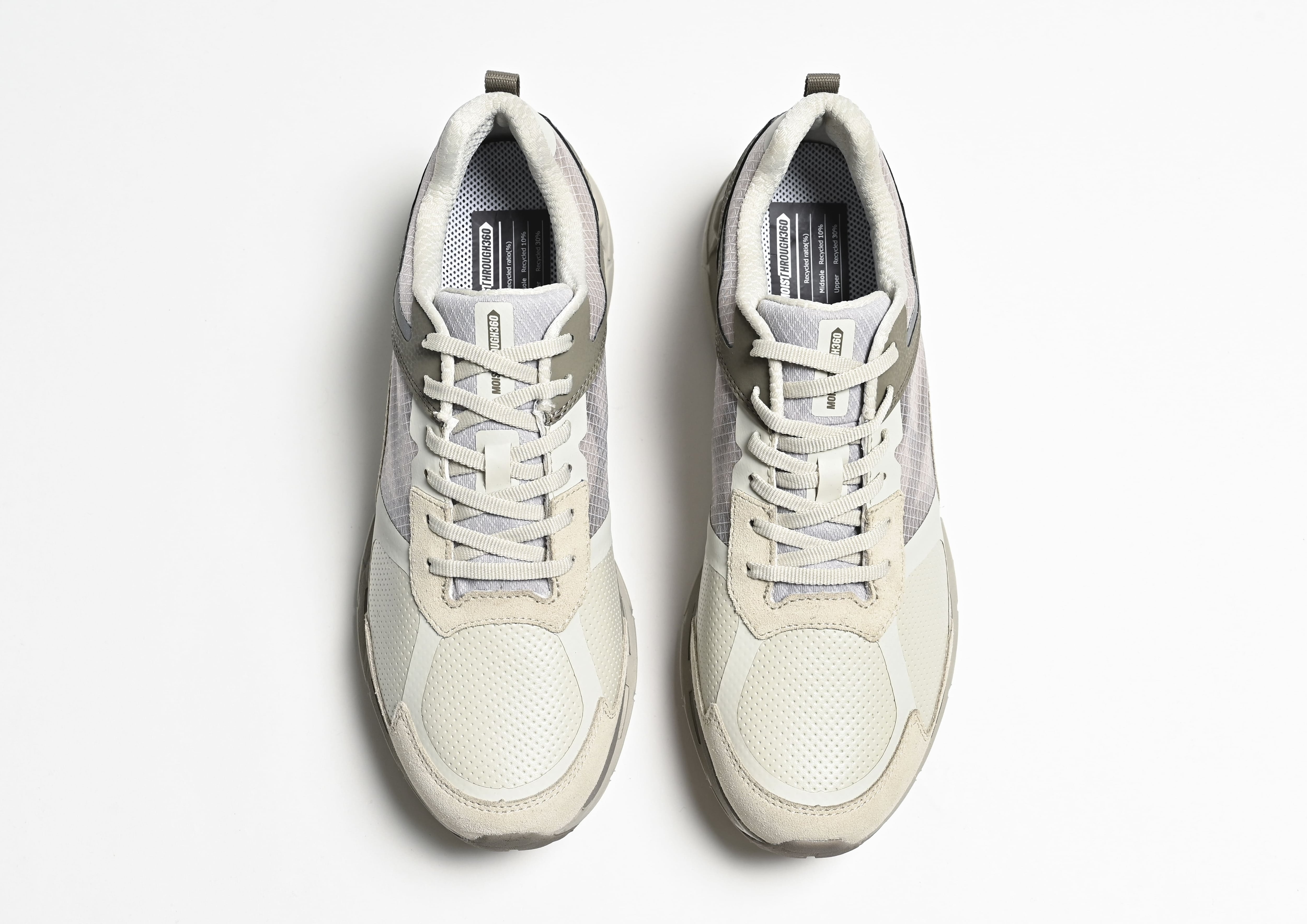 一般的な防水スニーカーは空気を通しにくい防水フィルムが使用されており、シューズ内に湿気が溜まりやすく、蒸れが生じ不快になりがち。MOISTHROUGH360は、防水フィルムの代わりにアッパー材の全てに水を通さず空気と水蒸気をしっかりと通すことのできる強力な防水加工が施された特殊素材を用いることで、従来の防水スニーカー同様の防水性を保持しながら、高い通気・透湿性を持つ高機能を実現させている。歩行と連動してシューズ内の空気と水蒸気を排出する特許取得のポンプ機能が働き、シューズ内の湿度が上昇しにくく、長時間使用してもシューズ内の湿度を外気と同等に保つことが可能となっている。
