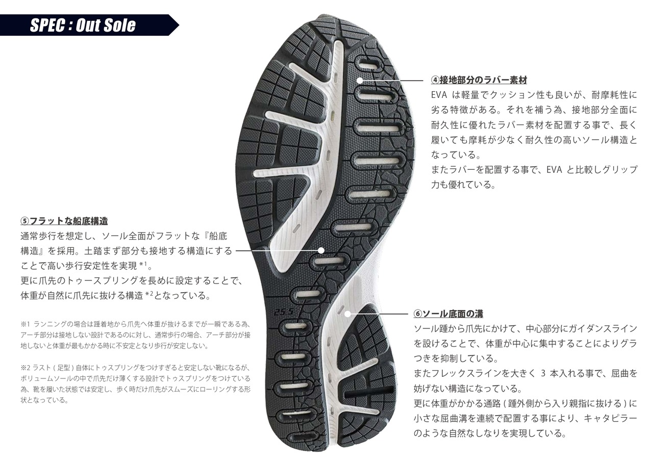 30%のメッシュ素材を使用し、ミッドソール上部にはリサイクル率10%のEVA素材を使用し環境にも配慮している。