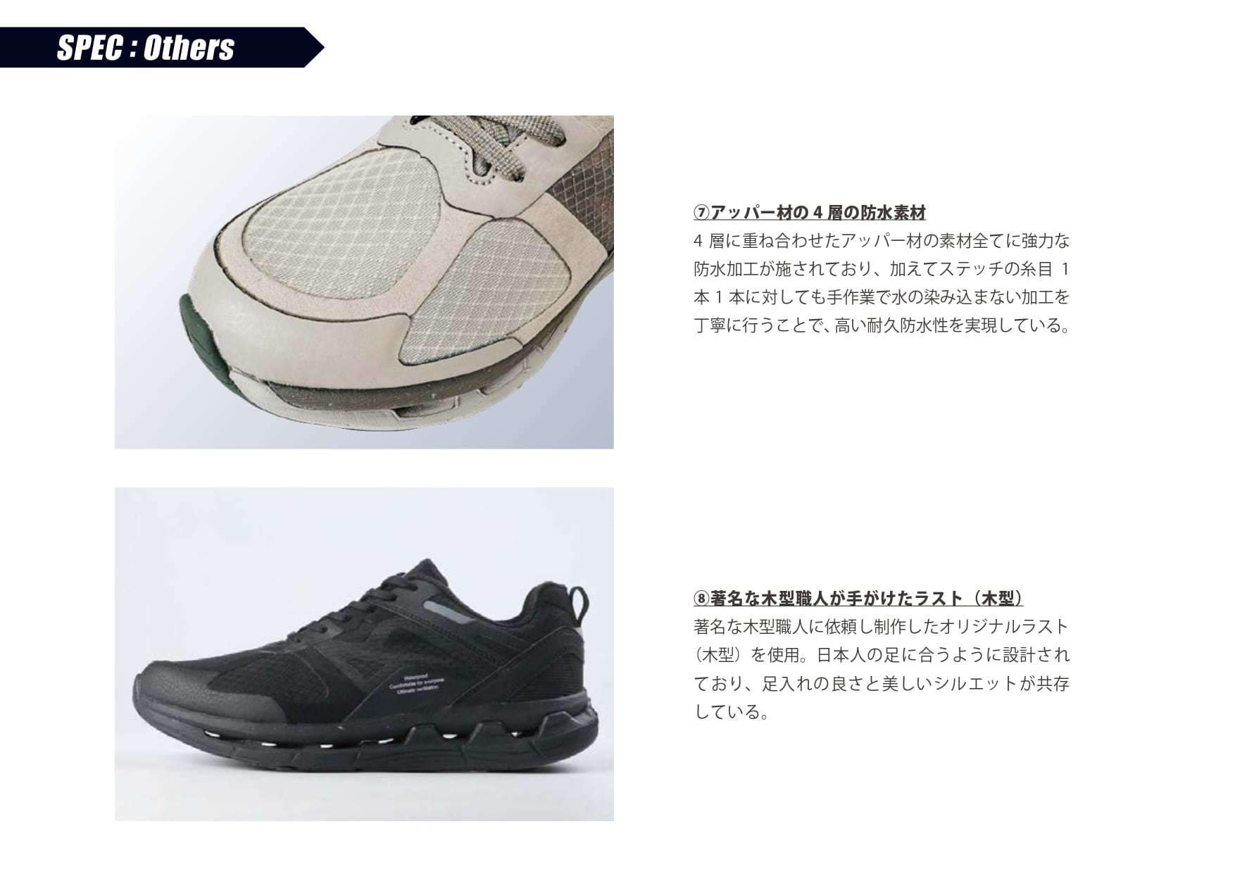 機能面だけでなく、国内でも著名な木型職人に依頼し制作したオリジナルラスト(木型)を採用。日本人の足に合うように設計されており、足入れの良さと美しいシルエットを共存させている。